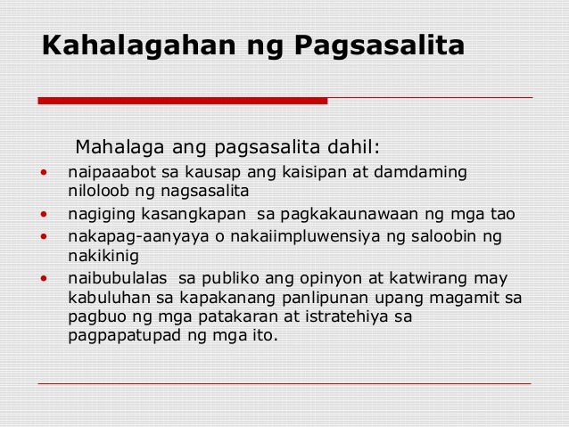 May matapat na layunin sa pakikipag-usap. Start studying SH-FIL 2. Ang pagsasalita ay kakayahan at kasanayan ng tao na maihayag ang kanyang ideya paniniwala at nadarama sa pamamagitan ng paggamit ng wikang nauunawaan ng kanyang kausap.