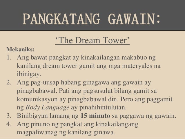 Ang epektibong pagpapahayag ng kaisipan saloobin naisin at damdamin ay isang mahalagang bahagi sa proseso ng pakikipagtalastasan. Ang bawat pangkat ay kinakailangan makabuo ng kanilang dream tower gamit ang mga materyales na ibinigay. Ang pangunahing kasangkapan upang maisakatuparan ang matagumpay na pakikipagtalastasan ay paggamit ng wika.