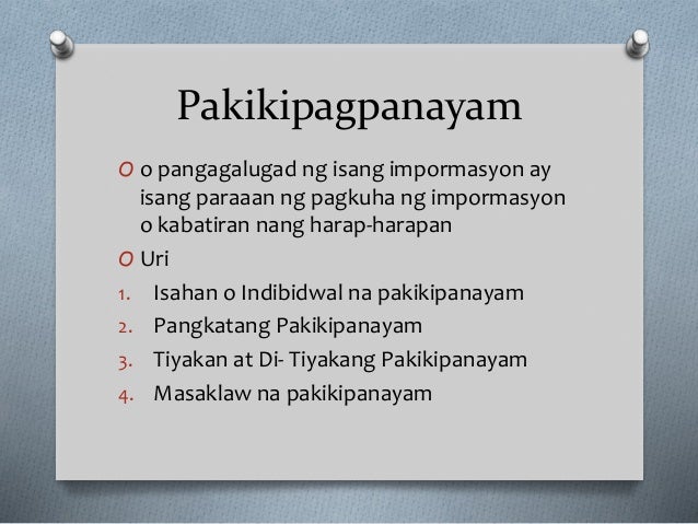 Makrong kasanayan sa pakikinig 6. Sa kahusayan niya sa pagpapahayag nakasalalay ang linaw ng mensaheng nais niyang iparating sa kanyang kapwa. Pag-uusap ng dalawa o higit pang bilang ng mga tao.