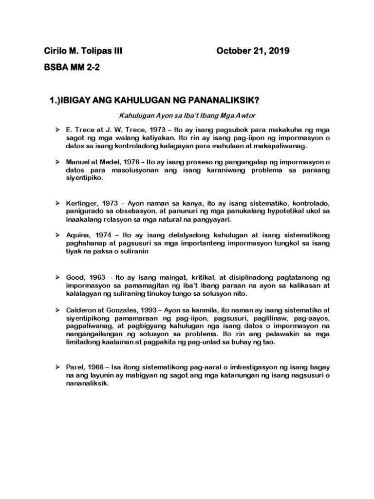Sagot Sa Tanong Na Ano Ang Pananaliksik PANANALIKSIK Sa paksang ito tatalakayin natin kung ano ang pananaliksik ang depinisyon nito at mga halimbawa. Mga katangian ng agham. Binigyang-kahulugan nina Nuncio et al2013ang pananaliksik bilang isang lohikal na proseso ng paghahanap ng sagot sa mga tanong ng mananalikisik na nakabatay sa problema at metado ng pag-aaral tungo sa produksiyon ng maraming kaalaman at kasanayan upang makatugon sa pangangailangan ng tao at lipunan.