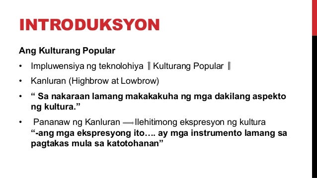 Dito nangingibabaw ang kahalagaan ng teknolohiya sa kulturang popular. KONTEKSTO NG KULTURANG POPULAR Nagmula sa kanluran. Ang Kulturang Popular ng Kritika at Kritika ng Kulturang Popular sa Seryeng Panayam Br.