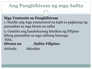 Hiram na Salita Filipino Attitude Saloobin 2. Ang mga hiram na salita ay mga salitang bahagi ng wikang Filipino na kinuha sa wikang dayuhan katulad lamang ng Ingles Kastila at iba pa. Ano ang ibig sabihin ng salitang preventive.