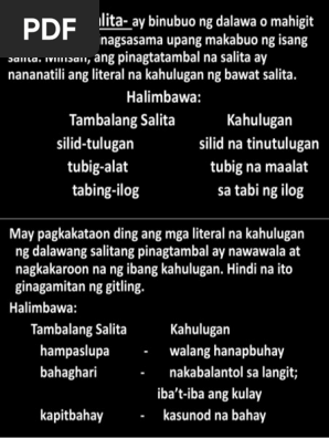 Mga_halimbawa_ng_tambalang_salita_at_mga_kahulugan_nitoMga_halimbawa_ng_tambalang_salita_at_mga_kahulugan_nitoMga halimbawa ng tambalang salita at mga kahulugan nitoTaingang-kawali- taong nagbibingi-bingihanIngat-yaman - tresyurera o tresyurero tagapag-ingat ng salapi o ari-arian ng isang tao o organisasyonPatay. Tambalang salita na nananatili ang kahulugan abot-kamay anak-dalita tikop-tuhod tawid-dagat tubig-alat. Likas na yaman Natural Resources Ang ating kapaligiran.