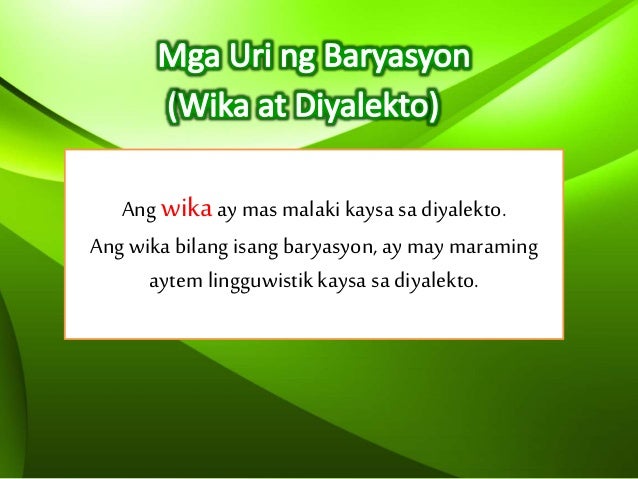 Ask questions submit answers leave comments. Barayti at baryasyon ng wika kahulugan. Dayalekto - Ito ang wika o salita na pangkaraniwang ginagamit ng mga tao sa rehiyon o lalawigan na kanilang ginagalawan.