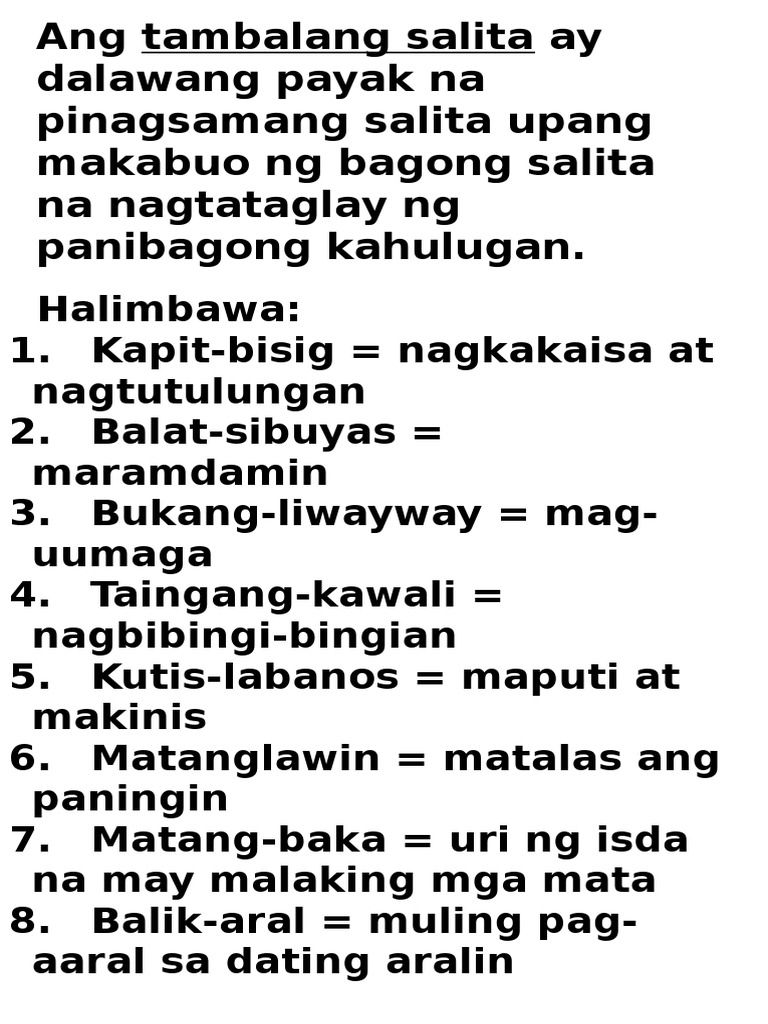 Tambalang salita na ang kahulugan ay iba sa kahulugan ng dalawang salita na pinagtatambal abot-agaw bahag-buntot bahay-bata balatkayo hanapbuhay pantay-paa rosas-hapon. Ayon sa kaniya ang isang salita.