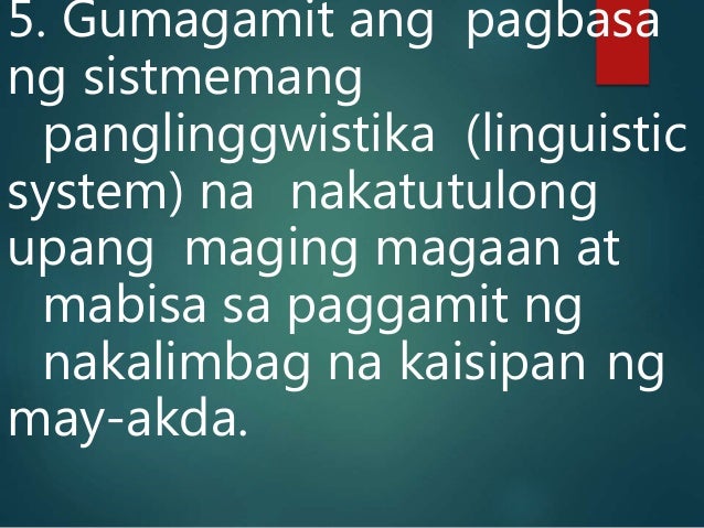 Limang Hakbang tungo sa Sintopikal na Pagbasa 1. Sa gawaing ito ang mensaheng nais iparating ng manunulat ay inuunawa at binibigyan ng interpretasyon ng mga mambabasa. Ay isa sa limang kasanayang pangwika pagkilala at pagkuha ng mga ideya at kaisipan sa mga nakalimbag na simbolo proseso ng pag-unawa sa mga mensaheng nais ibahagi ng may-akda sa babasa ng.