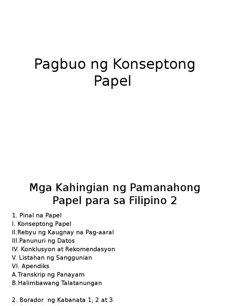 Makatutulong ang konseptong papel upang lalong magabayan o mabigyang-direksiyon ang mananaliksik lalo na kung siyay baguhan pa lang sa gawaing ito. Ito ay maaaring maging kritikal na sanaysay lab report eksperimento konseptong papel term paper o pamanahong papel thesis o disertasyonItinuturing din itong isang intelektwal na pagsulat dahil layunin nitong pataasin ang antas at kalidad ng kaalaman ng mga estudyante sa paaralanMga Uri ng Pagsulat. ناصر منجالينو اللغات- فلبيني.