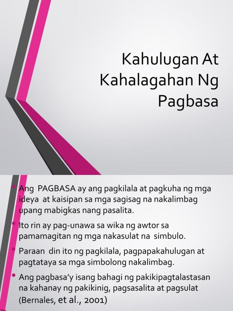 Kahulugan At Kahalagahan Ang pagbasa ay pagkilala pag-unawa pagpapakahulugan at pagtataya ng mga ideya sa mga nakalimbag na simbolo. Ito ay proseso ng pag-unawa sa mga kaisipang hatid ng. Ang pagbasa ay pagkilala pag-unawa pagpapakahulugan at pagtataya ng mga ideya sa mga nakalimbag na simbolo.