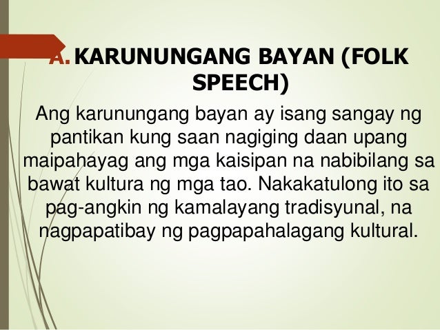 Human translations with examples. Ang karunungan bayan ay tumutukoy sa isang klase o uri ng panitikang idinadaan sa maraming paraan ng pagsasagot o paghuhula gaya ng paraang gawin ito sa bugtong na kailangan ng malalim na pagiisip at pwede rin itong idaan sa panitikang salawikain o maga idyomatikong salita na may mas malalim na kahulugan kesa sa literal na kahulugan nito kung gusto niyo ng mga halimbawa ng karunungan bayan. Basahin at unawain kung ano ang karunungang bayan halimbawa uri at kahalagahan nito sa ibaba.