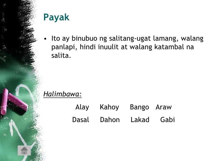 Salita na binubuo ng dalawang payak na salita na bumubuo ng panibagong salita. Tambalang-ganap pagtatambal ng dalawang salita na may magkaibang kahulugan upang makabuo ng ikatlong kahulugan na malayo sa kahulugan ng daliwang salita. Almost exhausted or used up abot-kisap continuous or rapid winking agaw-dilim twilight dusk agaw-liwanag dawn daybreak agaw-tulog the state or condition of being half-asleep akdang-guro masterpiece akyat-bahay theft or.