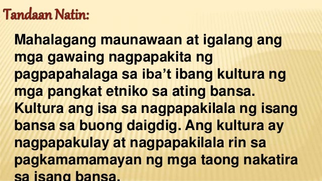 Gayunman dahil ang ilang pangkat etniko o mga. Ito ay tumutukoy sa isang grupo ng lahi ng mga tao na mayroong sariling pagkakakilanlan tulad ng pagkakaroon ng sariling kultura relihiyon lingguwahe at pinagmulan. Ang pangkat etniko ay grupo ng mga tao na naninirahan sa iisang lugar dala ang pareparehong paniniwalakulturarelihiyonwika tradisyon at kaugalian.
