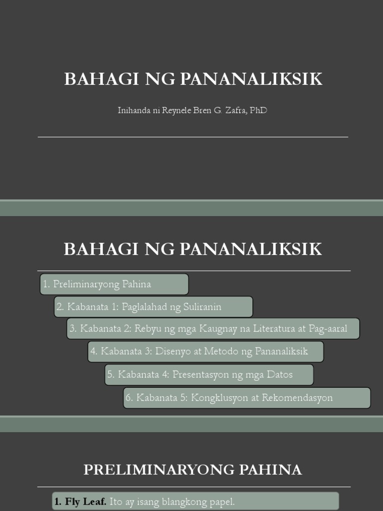 MGA BAHAGI NG PANANALIKSI K Preliminaring Pahina. Sa panimula rin may talakay sa kahulugan ng mga terminolohiyang ginamit. MGA BAHAGIMGA BAHAGI ATAT PROSESO NG PANANALIKSIKPROSESO NG PANANALIKSIK 2.