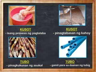 Mga salitang magkapareho ang baybay ngunit magkaiba angkahulugan. Gabi- isang uri ng gulay. KUSOT - isang proseso ng paglalaba KUSOT - pinagtabasan ng kahoy TUBO - pinagkukunan ng asukal TUBO - gamit para.