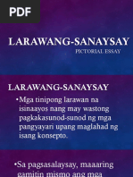Maaaring anyo ng larawang sanaysay. Bukod pa rito nakatutulong ang pictorial essay na maging mas malikhain ang mga gumagawa ng sanaysay at ikonekta ang mga pangyayari sa kaniyang nakuha na litrato. Komposisyon Artistik na kuha.